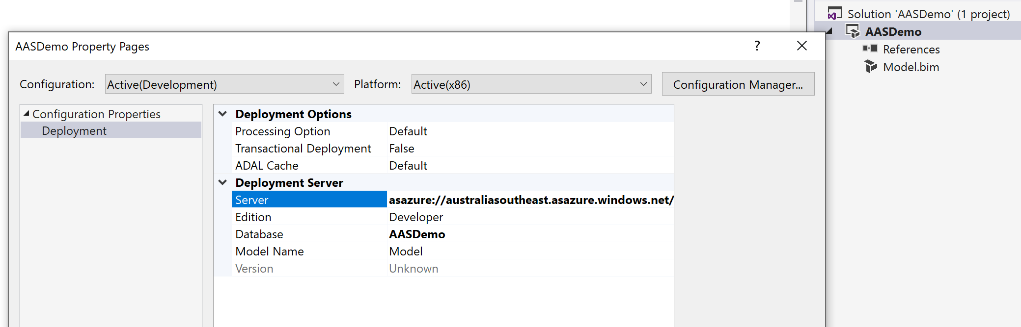 When development is complete, ensure the Deployment Server property contains the Azure Analysis Services servername, which you can get from the Overview page of your AAS instance in the Azure portal.