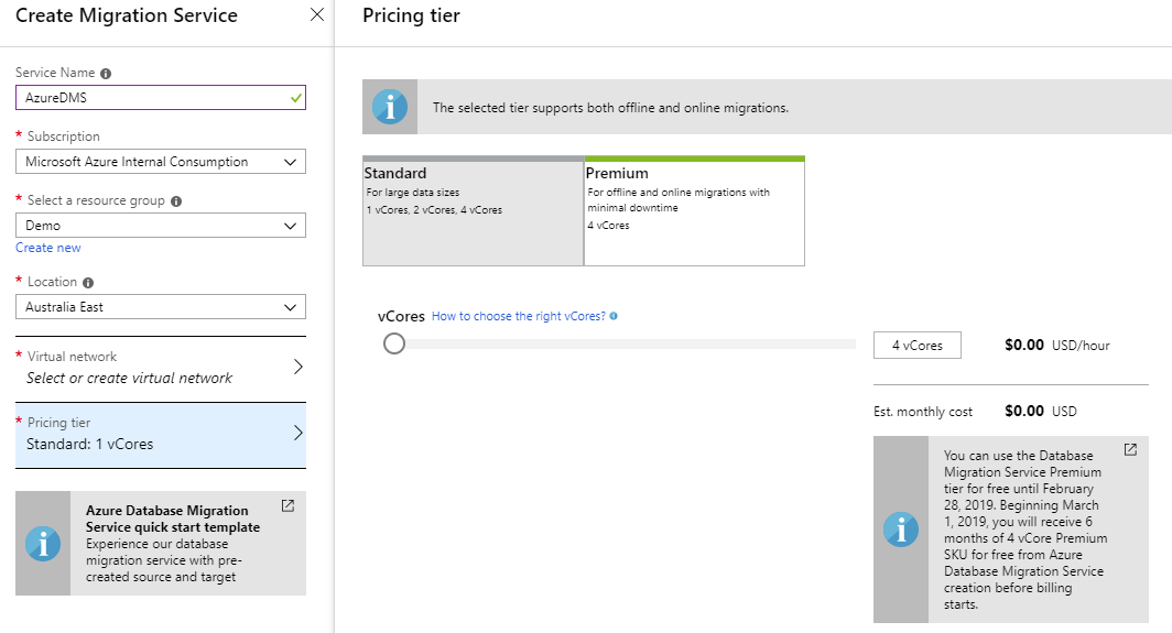 The pricing tier options comes in Standard and Performance. Standard lets you choose from 1-4 cores, and Premium is 4 cores by default. Importantly, only the Premium option enables you to perform minimal downtime migrations, which we’ll cover later.