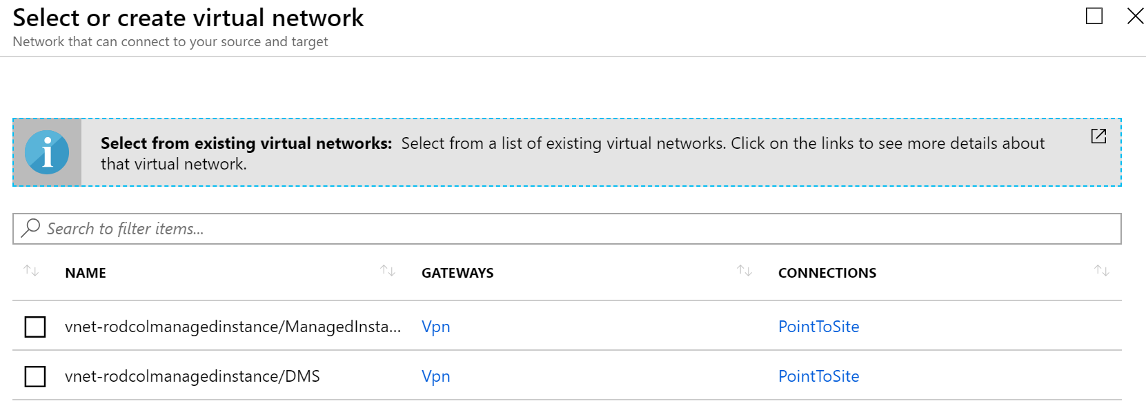 An important note on the subnets: Before you create the Database Migration Service, create a new Subnet in the Managed Instance vNet. I called my Subnet “DMS”. When you create the Database Migration Service, it will ask you what vNet to create the service in. Be sure to choose the dedicated subnet you’ve created. In the example below, I chose the vnet-rodcolmanagedinstance/DMS option. The other option listed contains the ManagedInstance itself, and shouldn’t be selected for the Database Migration Service.