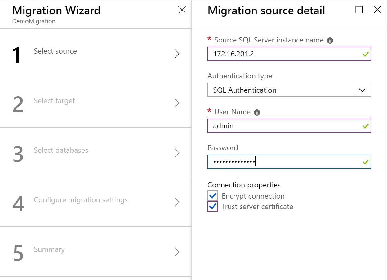 For step 1, enter the source SQL Server details, as per the below example. In my case, I entered the IP address of my laptop running a local SQL Server installation. Note; if you’re doing the same as me, ensure you’re running the point-to-site VPN that we created in the previous post, and use the IP Address from the VPN adapter, available by running ipconfig in a command window. I also clicked “Trust Server Certificate”. Alternatively, follow this link.