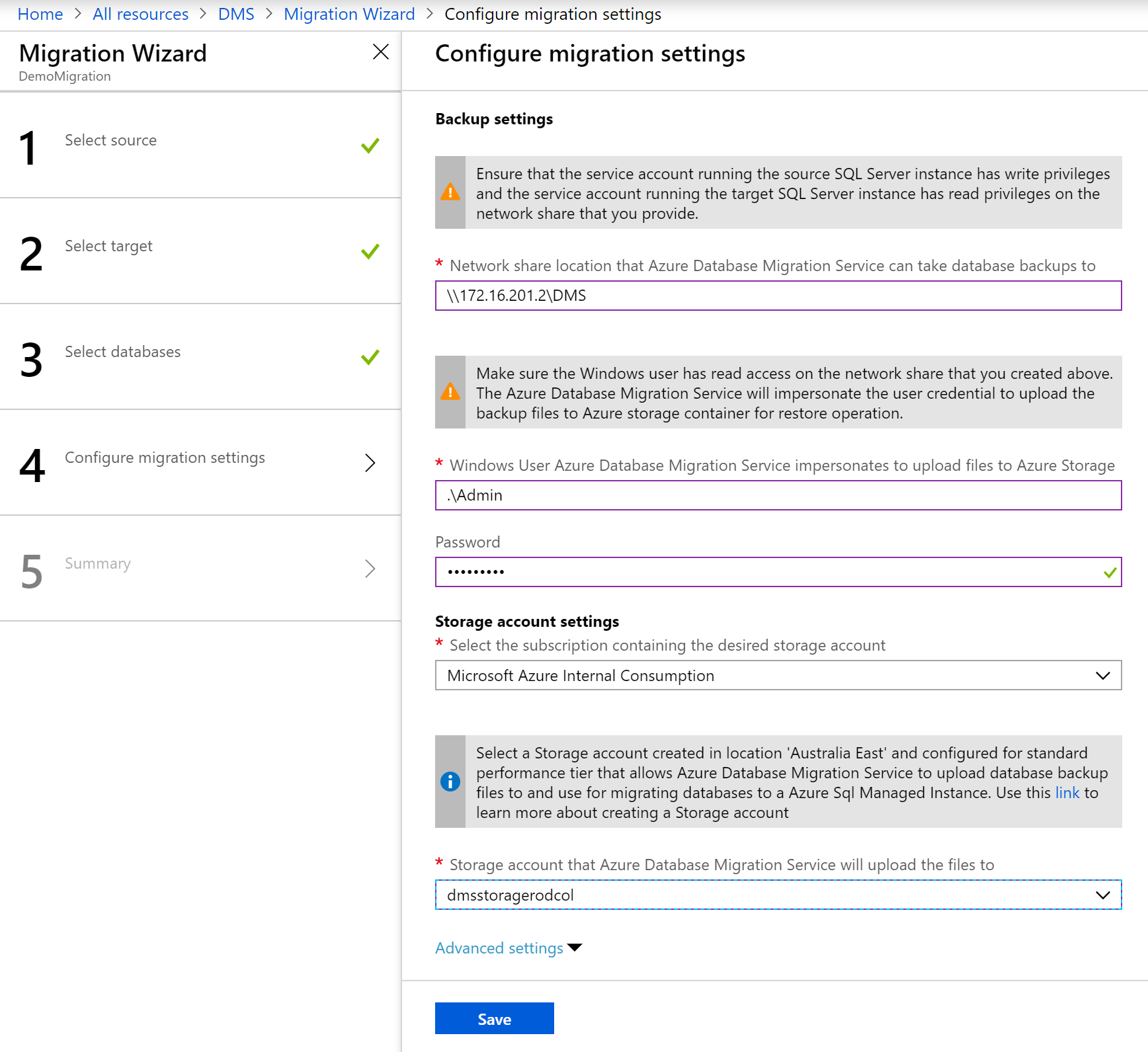 For step 4, enter the network share, along with a Windows account and password that has access to the share. This account will be impersonated by the Migration Service to obtain the backup files. Finally, select the storage account you created earlier. This is where the Migration service will copy the backup files to restore to the destination, in my case, my Managed Instance.
